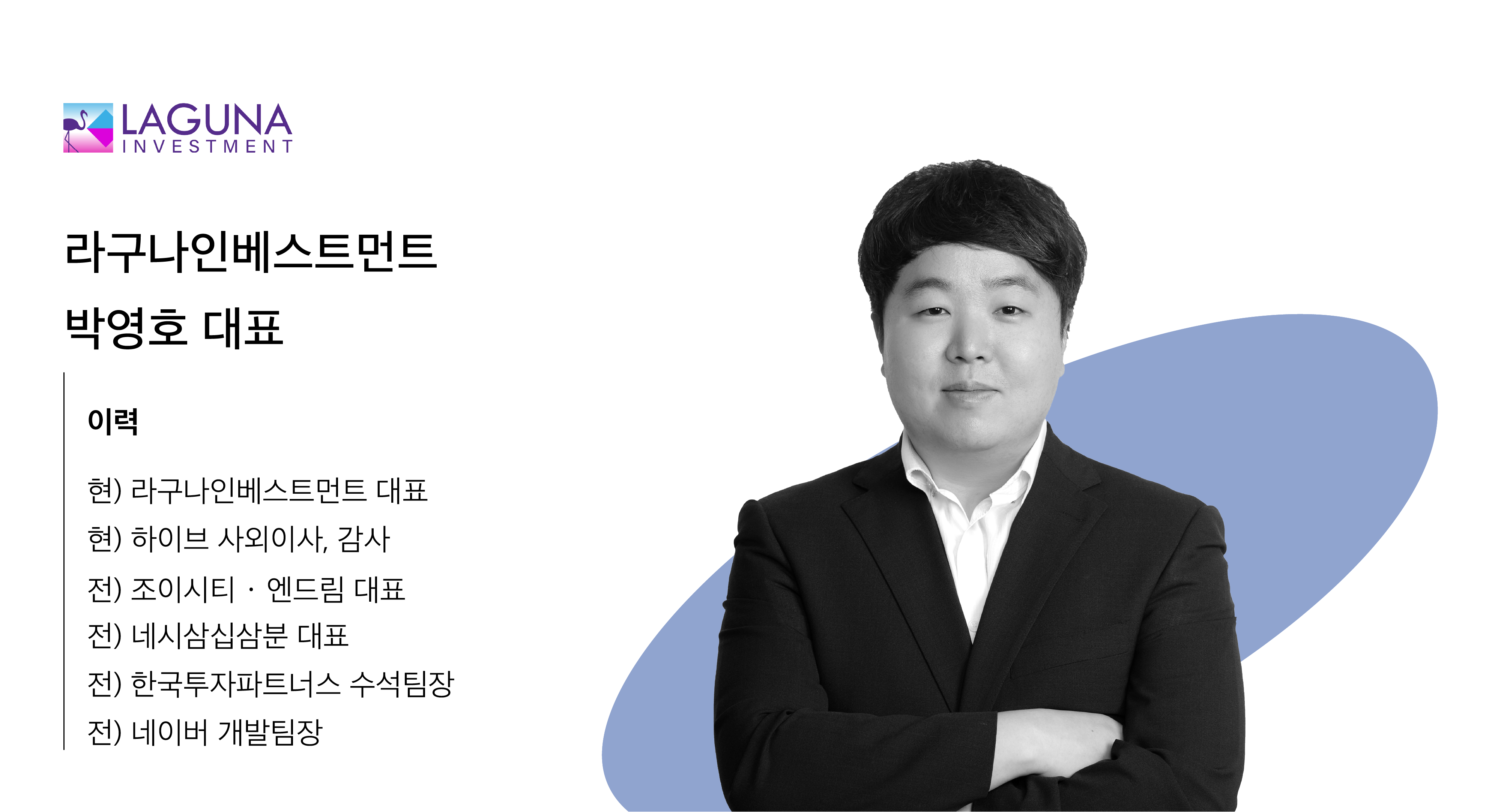 라구나인베스트먼트는 2018년에 설립된 신생 VC로 10년간 엔지니어로 프로덕트와 서비스 개발 경험을 갖춘 두 대표와, 공인회계사에 증권사 IPO팀 출신의 젊은 파트너 3인이 의기투합하여 만든 빠르게 성장하고 있는 하우스입니다. 게임, 콘텐츠, 인터넷 서비스, 바이오, IT 등 다양한 섹터에 투자 및 Exit 경험을 보유하고 있습니다.